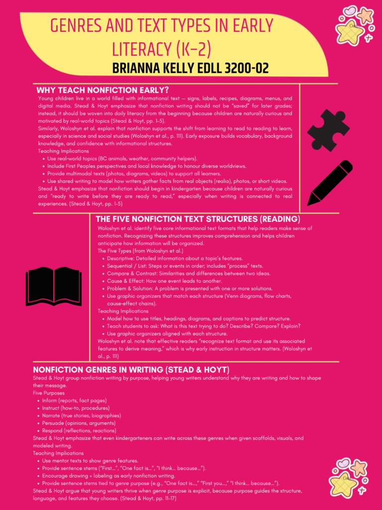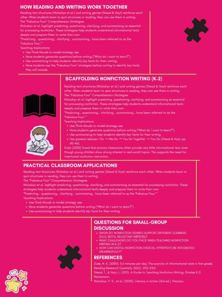 Creating this poster helped me deepen my understanding of how nonfiction reading and writing develop together in early literacy. Synthesizing research from Stead & Hoyt and Woloshyn et al. showed me how important it is to expose young learners to informational text early, especially through multimodal resources and explicit instruction in text structures. Designing the poster pushed me to think about how teachers can make nonfiction accessible, engaging, and culturally responsive. This artifact reflects my ability to translate theory into practical classroom tools and demonstrates my commitment to supporting diverse learners through clear scaffolding and purposeful literacy instruction.