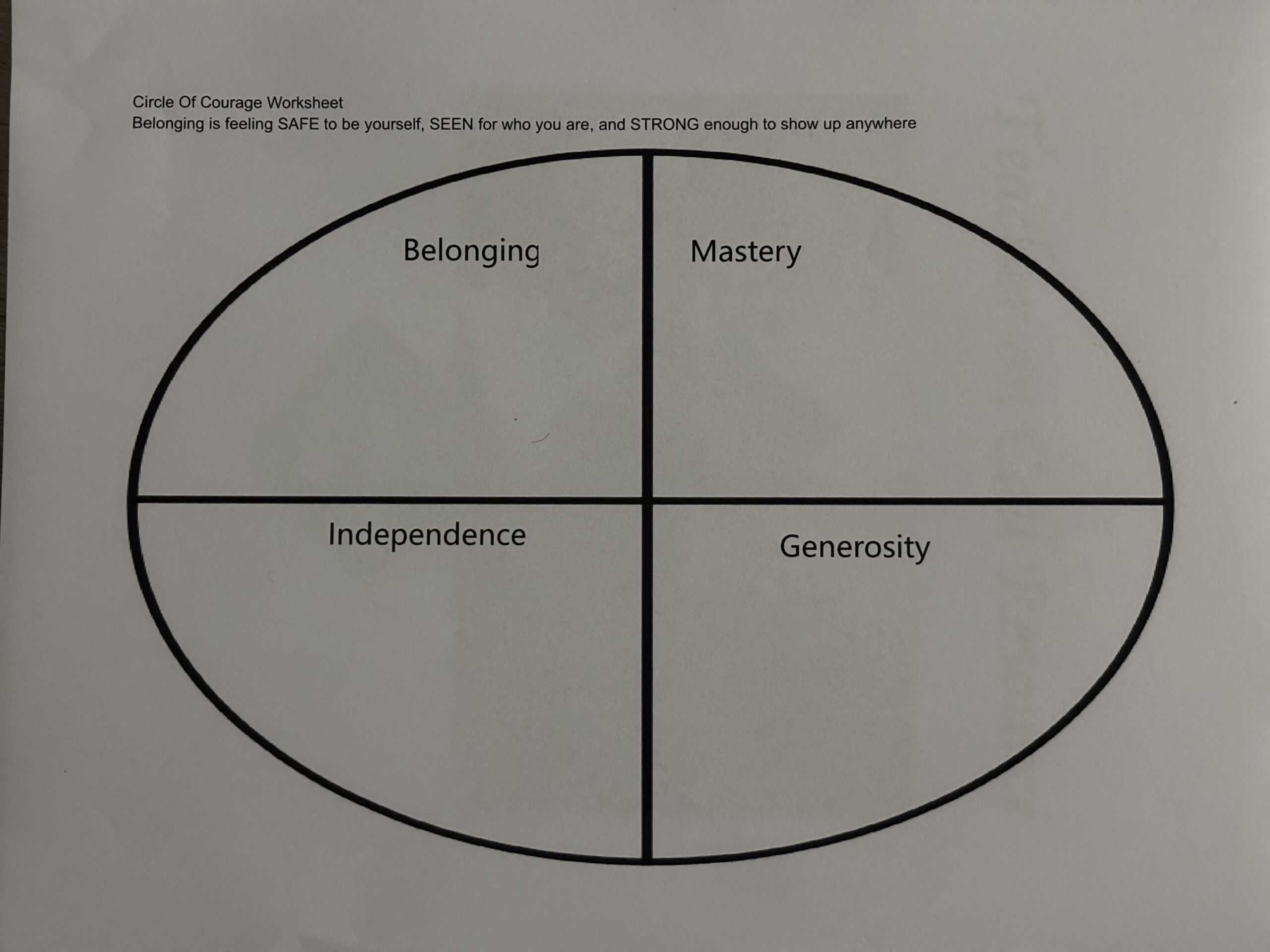 This worksheet was used in a practicum lesson to help students explore the concept of belonging through the Circle of Courage framework. Students reflected on the four quadrants—Belonging, Mastery, Independence, and Generosity, and used the prompts to identify moments when they felt safe, seen, or strong. The activity supported social‑emotional learning and encouraged students to connect their personal experiences to classroom community values.