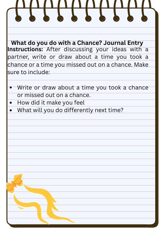 This journal activity was created as a follow‑up to the picture book What Do You Do With a Chance? Students were invited to write or draw about a time they took a chance or missed one, reflecting on their feelings and what they might do differently next time. The activity supports social‑emotional learning by helping students explore courage, self‑awareness, and personal growth through storytelling and reflection.